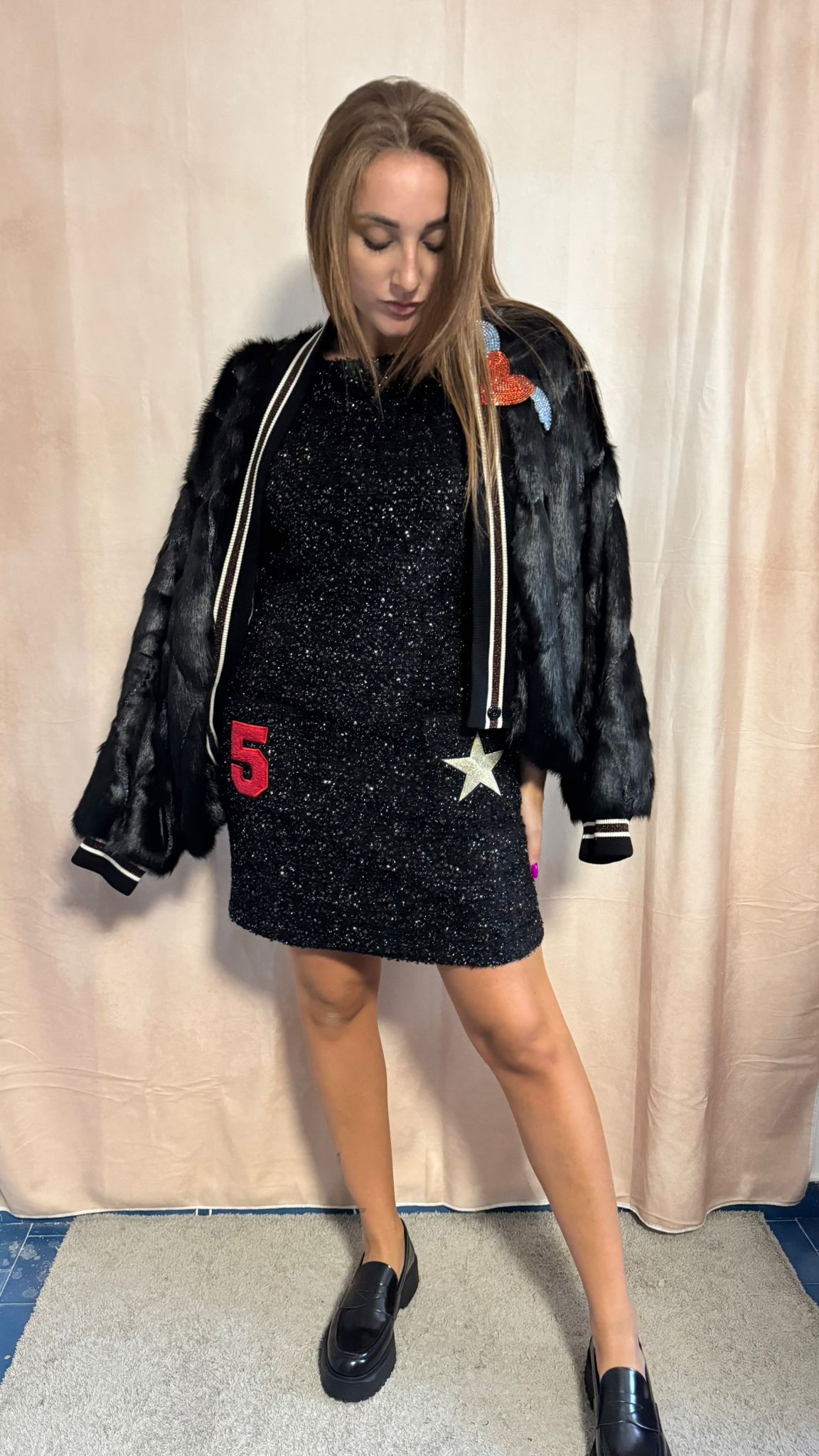 Abito in tweed con patch e lurex, al ginocchio e smanicato. Fodera maculata.