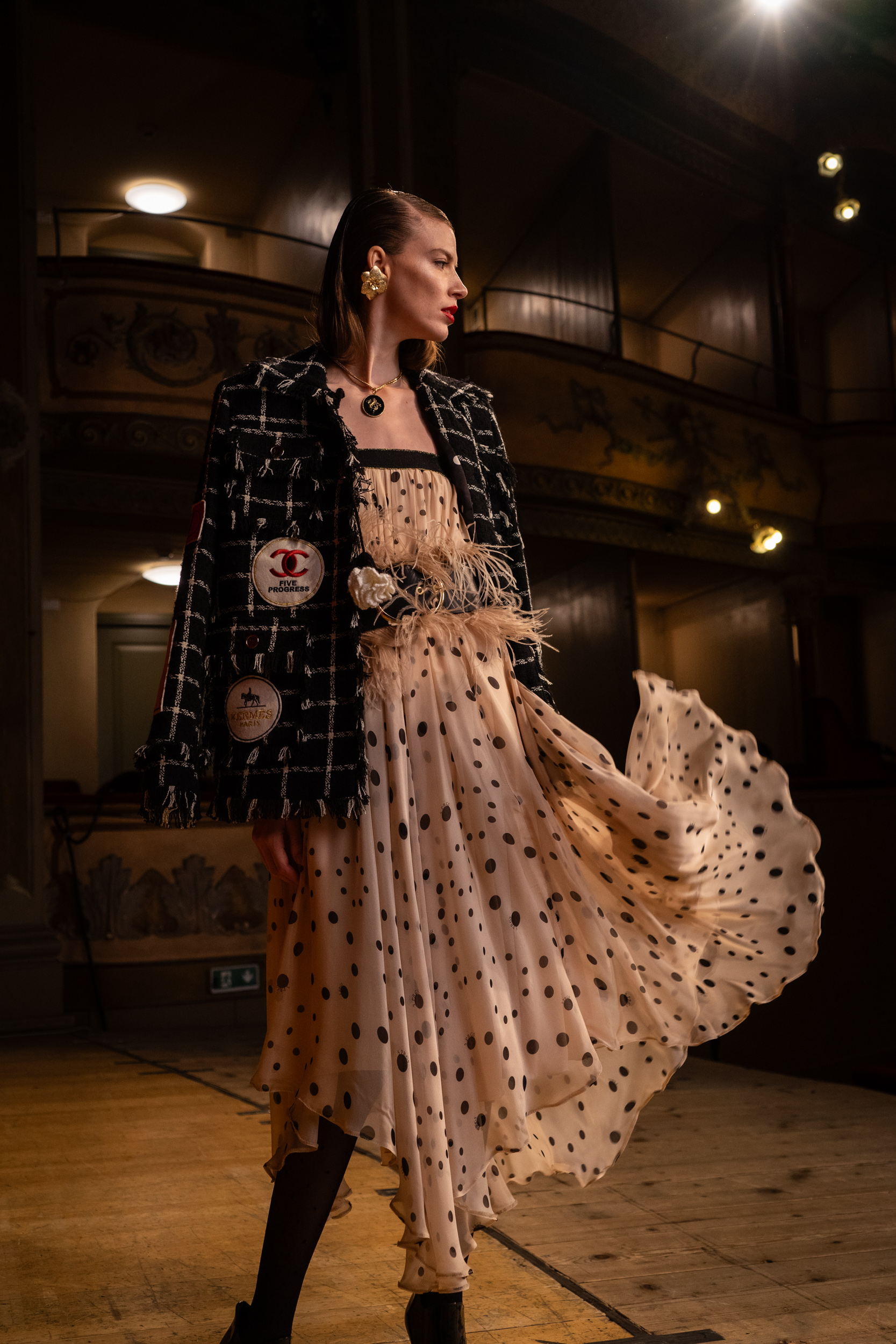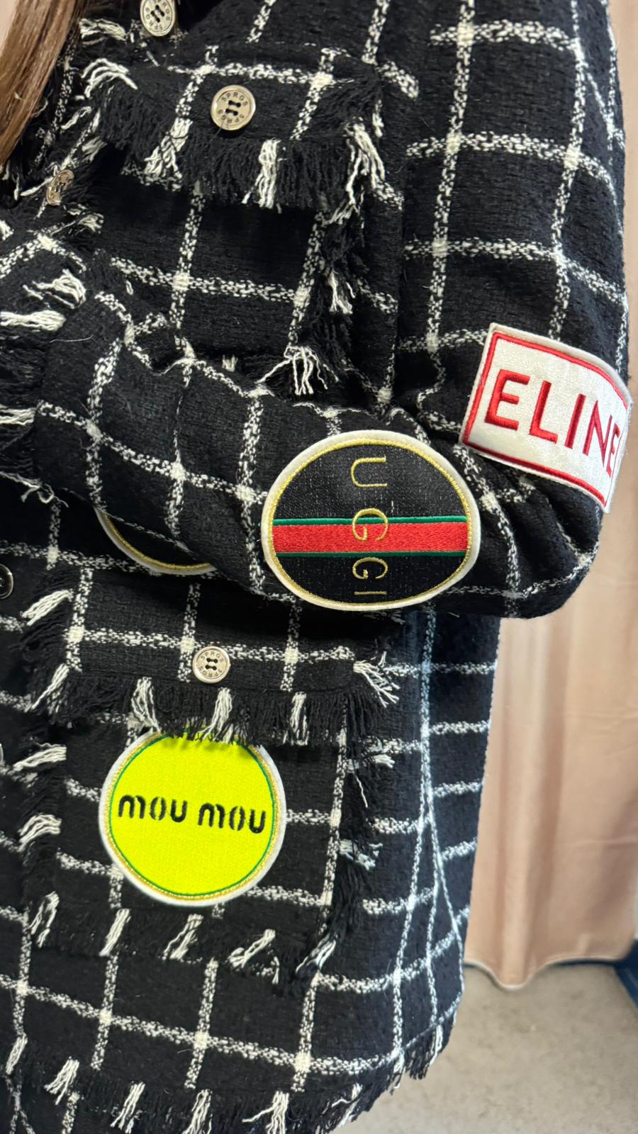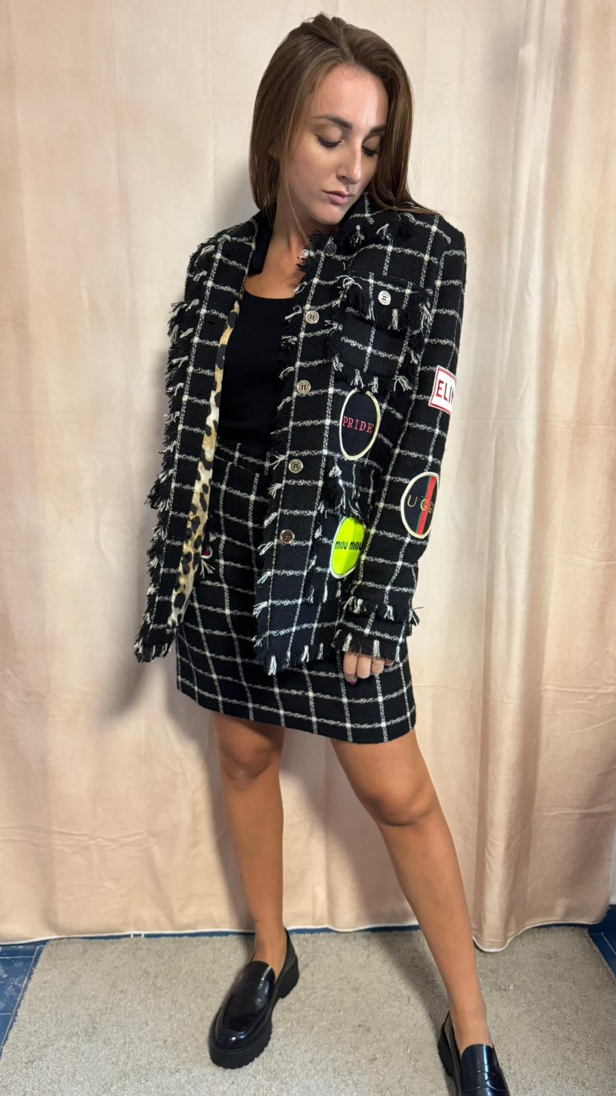 Giacca in tessuto tweed nero e bianco con patch. Foderata con stoffa maculata.