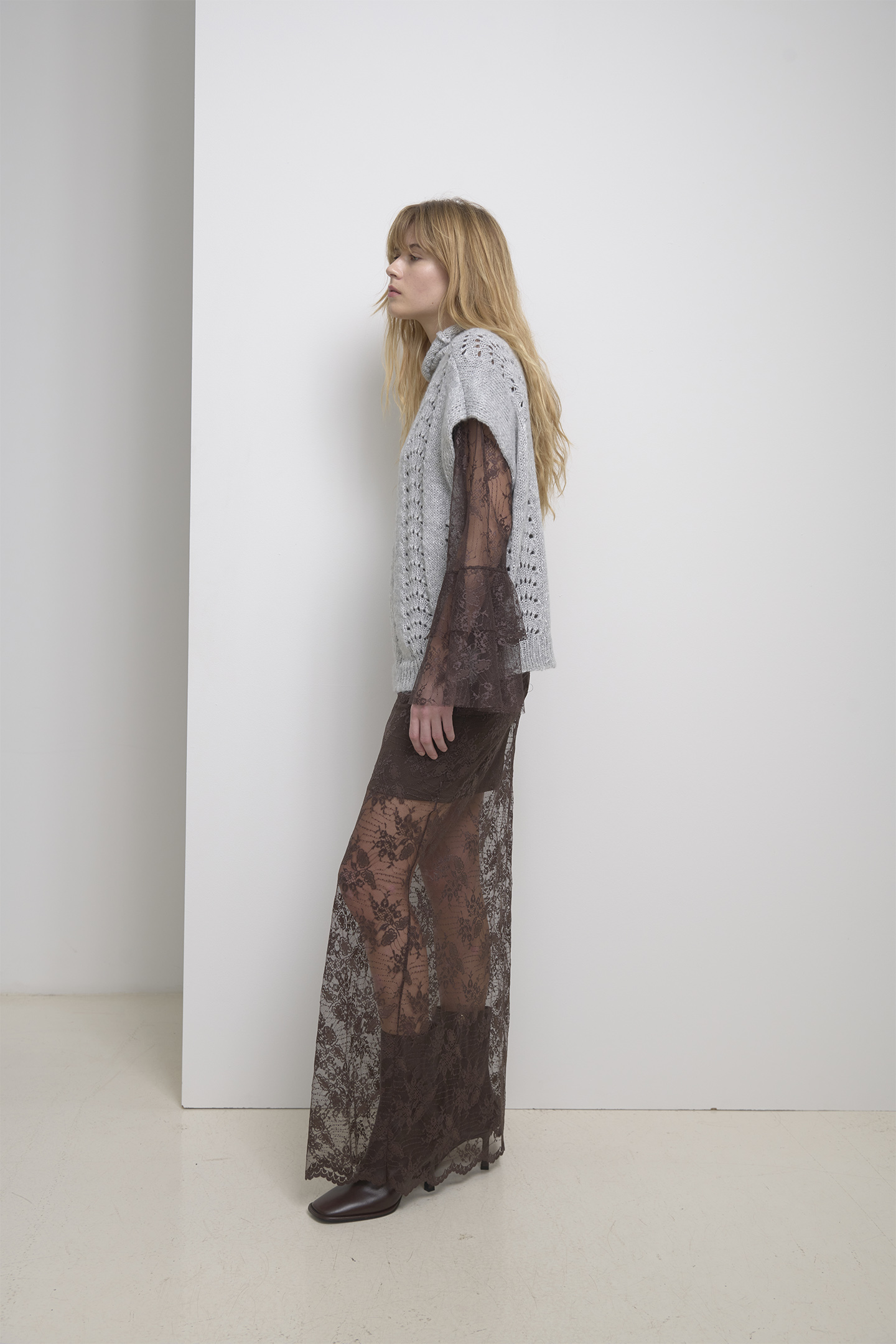 Gonna lunga in pizzo con motivo floreale, realizzata in tessuto trasparente con sottogonna in tono.