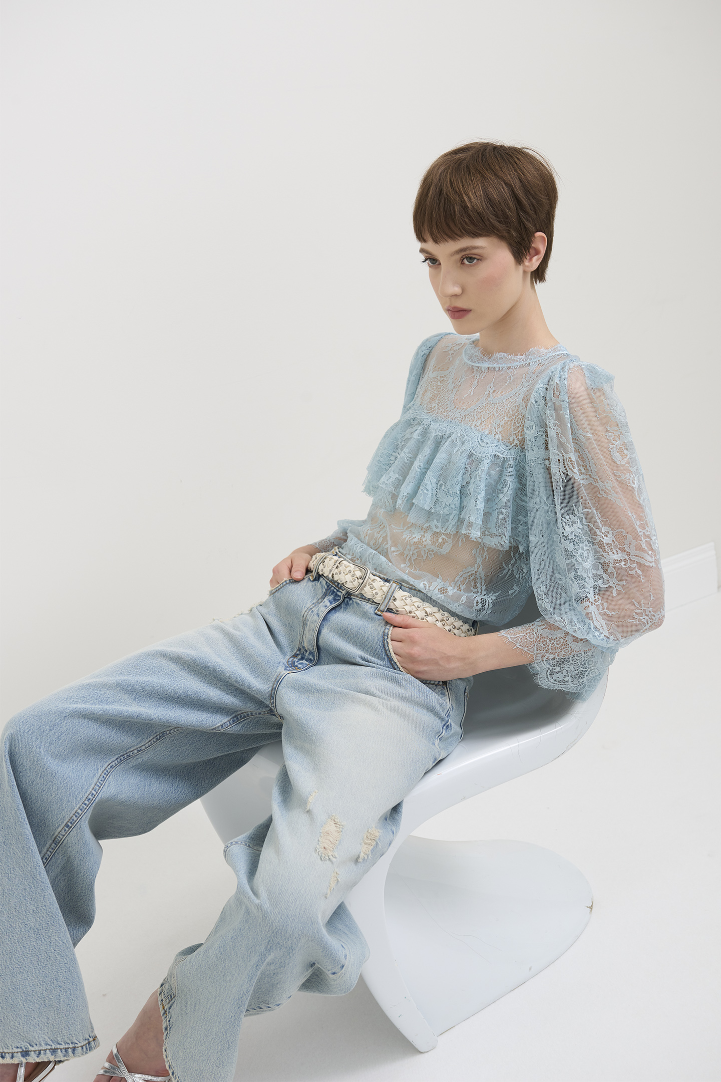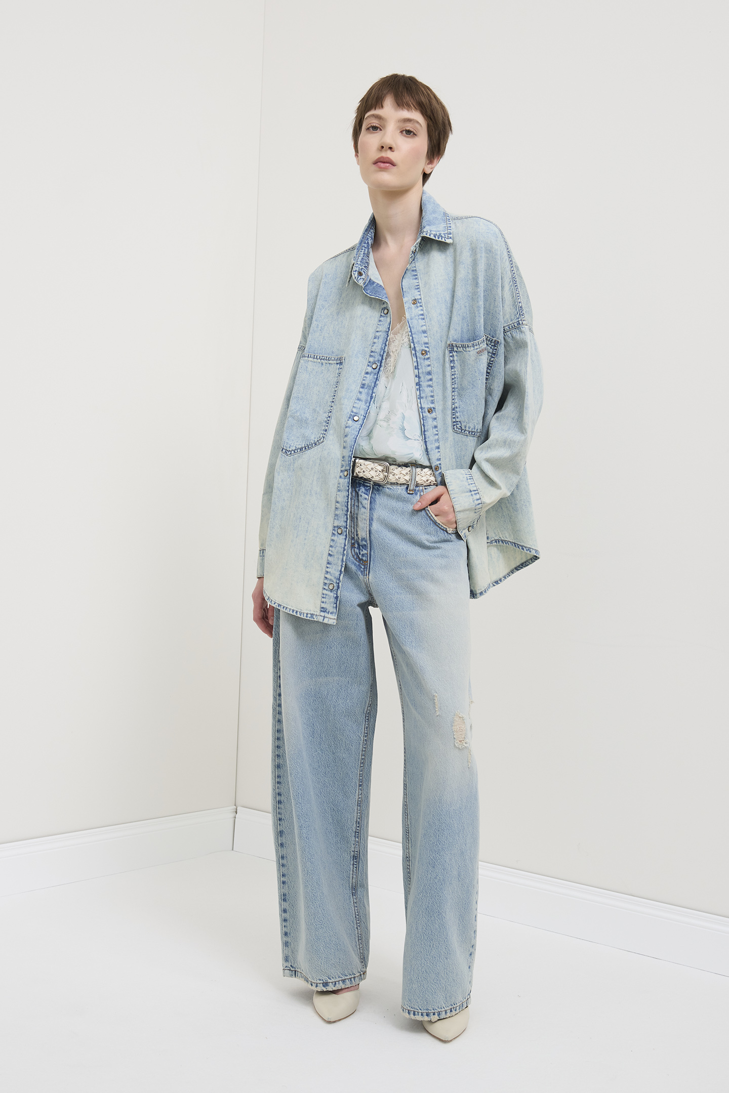 Jeans dalla linea wide leg in denim azzuro chiaro effetto sfumato stone washed.