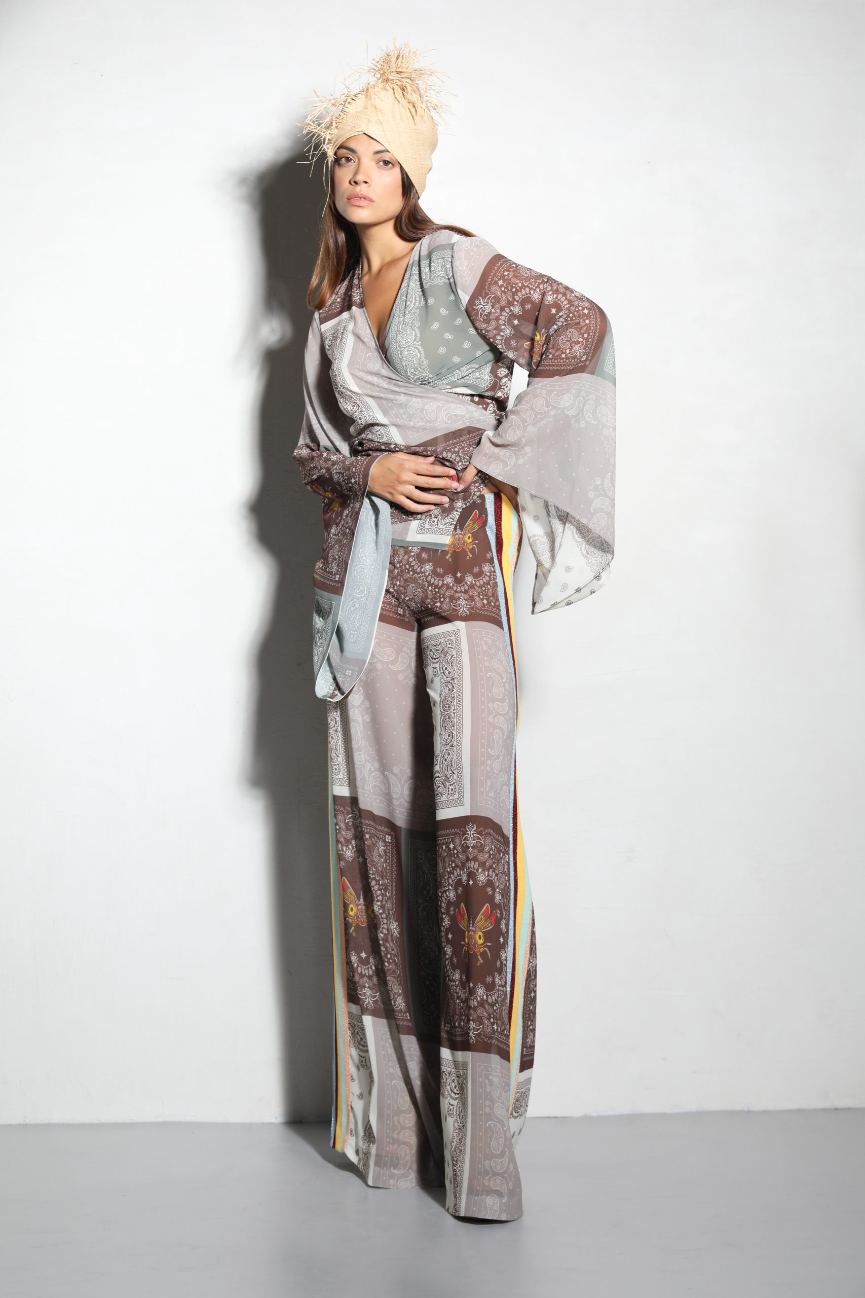 Il disegno “Bandana con Patch”, con il suo mix di pattern ispirati alla tradizione e dettagli sartoriali sofisticati, trasforma questo kimono in un pezzo unico e iconico. Le maniche ampie e fluide enfatizzano il movimento, mentre la cintura in vita permette di personalizzare la vestibilità, adattandosi con naturalezza alla silhouette.