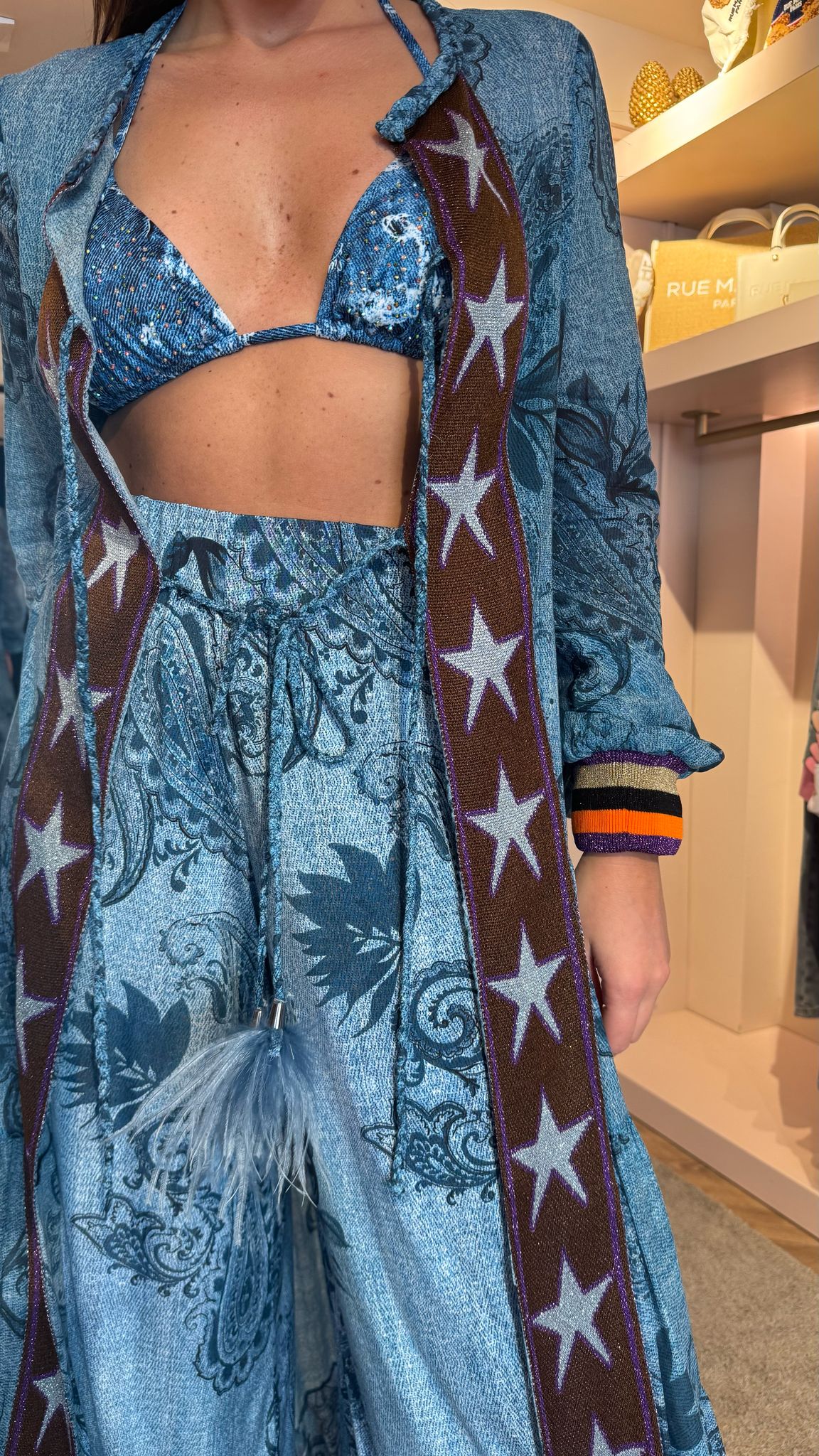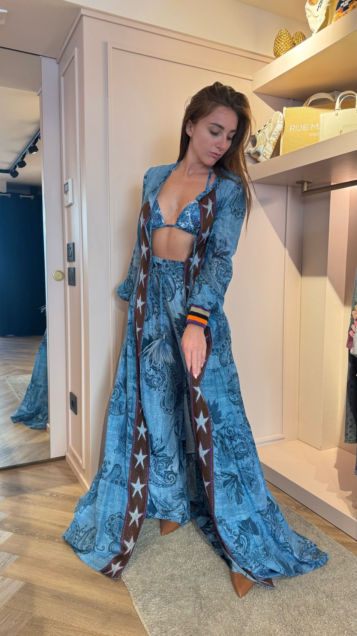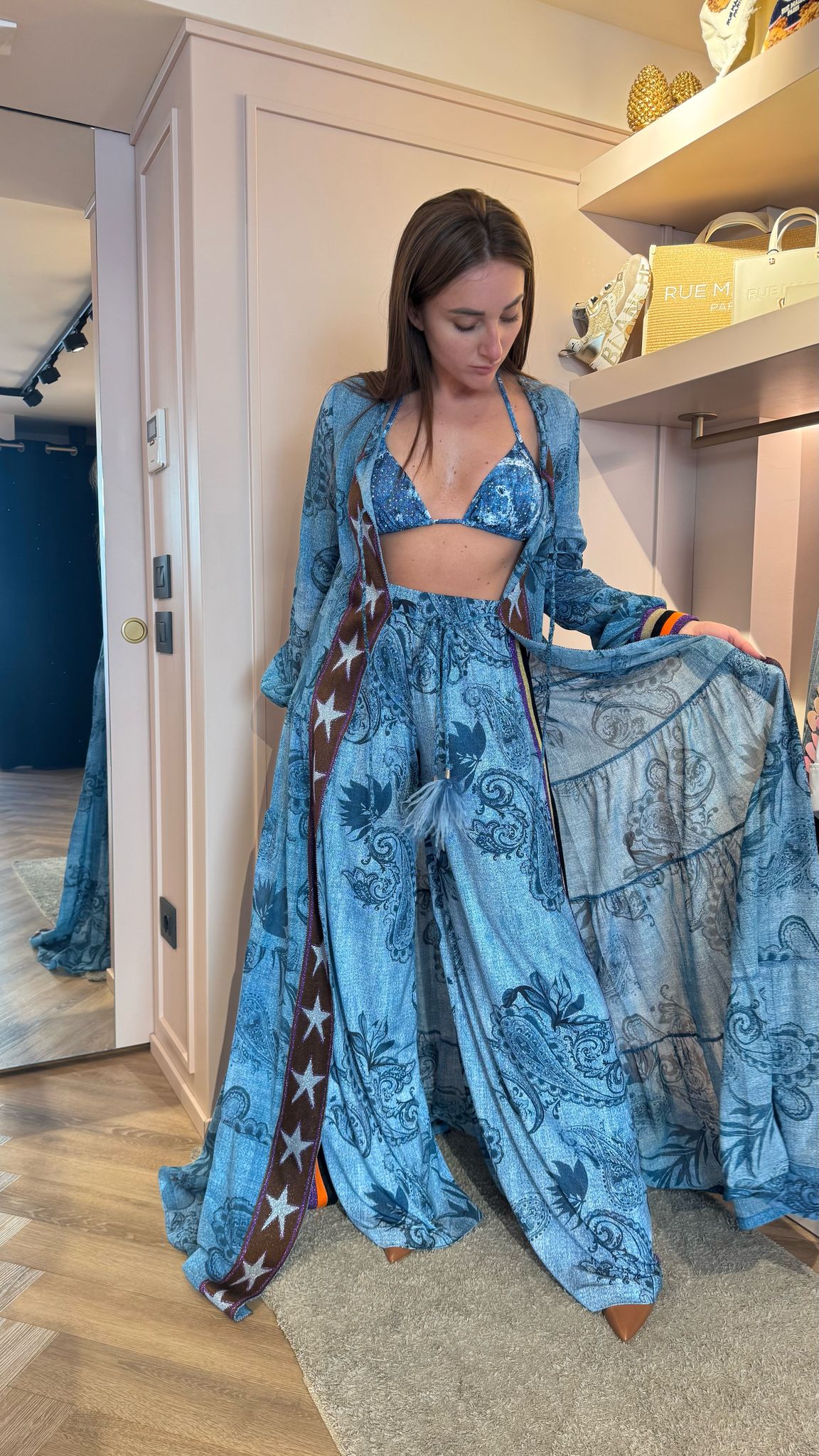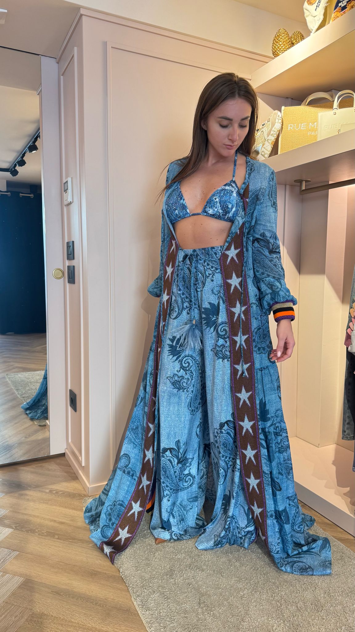 Il disegno cachemire, reinterpretato in una palette di tonalità denim, dona un effetto contemporaneo e versatile, perfetto per essere indossato su un look casual-chic o come copricostume esclusivo. Il taglio fluido enfatizzano il movimento, creando un effetto scenografico irresistibile.