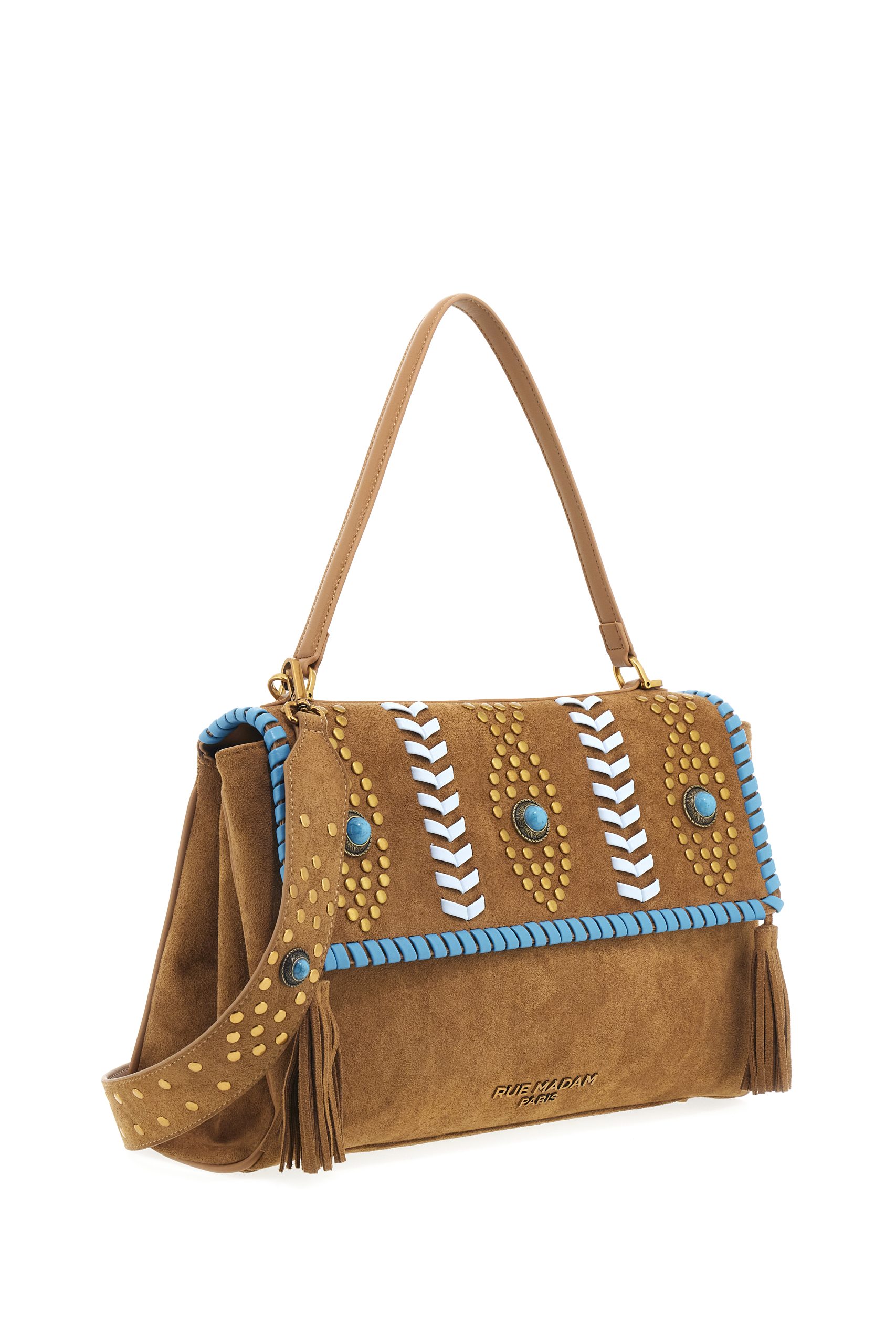 Borsa a spalla grande in morbido eco camoscio, dal design sofisticato e senza tempo, impreziosita da impunture decorative e borchie in stile etnico che ne esaltano il carattere. Arricchita da un logo in metallo con finitura oro e nappine in camoscio, dona un tocco ricercato e distintivo. Dotata di manico e tracolla removibile per una portabilità versatile, presenta uno scomparto centrale, oltre a fodera interna in cotone con tasca, per un’organizzazione pratica degli effetti personali.Dimensioni L 36 x H 25 x P 12 cm
