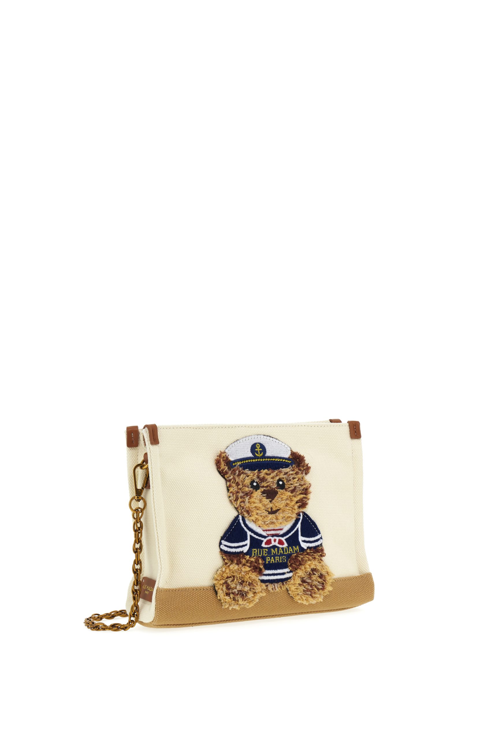 Clutch in canvas dal design compatto e contemporaneo, valorizzata dal fondo a contrasto e dal nuovo ricamo effetto peluche dell’orsetto Sailor Marvin, che aggiunge un tocco affettuoso e distintivo. Dotata di laccio da polso, dettagli in ecopelle e catenella removibile per un look versatile ed elegante. Interno con fodera in cotone e tasca, ideale per organizzare con stile gli oggetti essenziali. Dimensioni L 25.5 x H 20 x P 8 cm