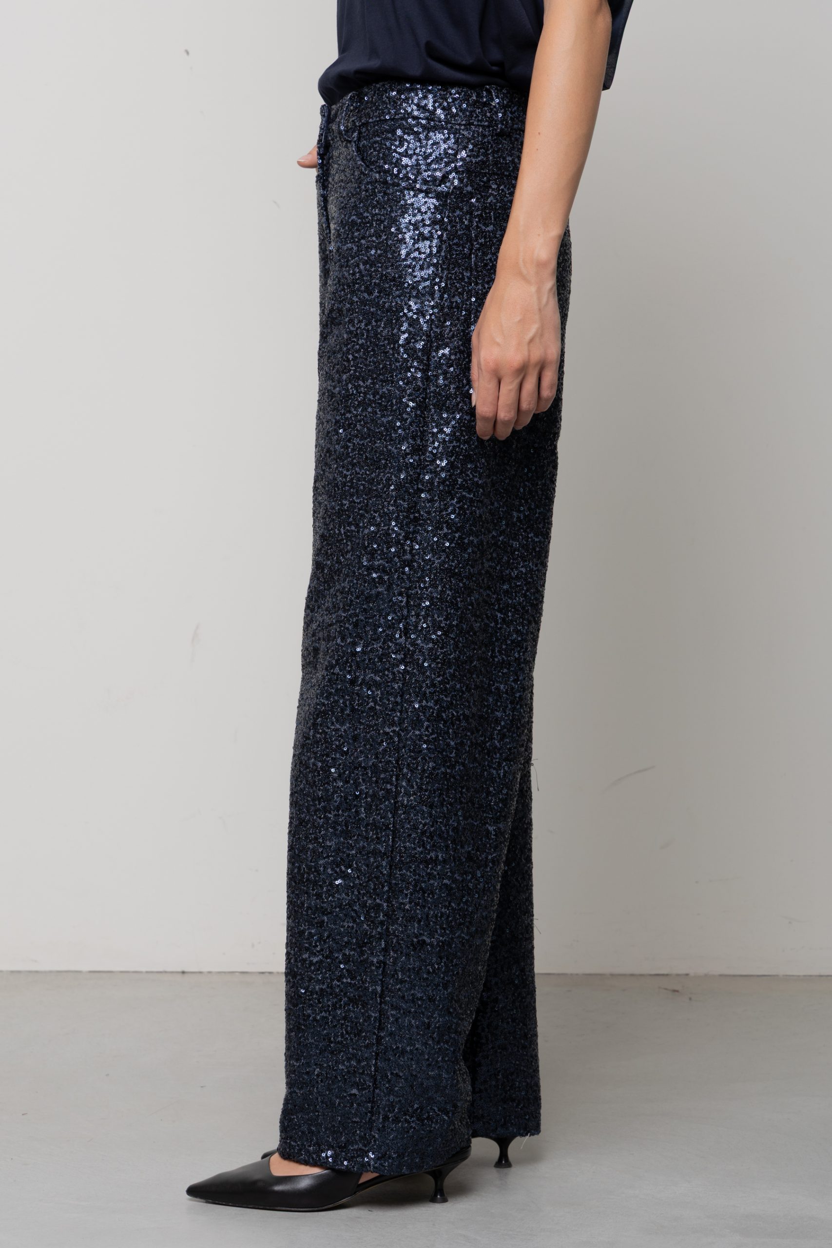 Pantalone con paillettes interamente foderato. Tasche laterali e sul retro.