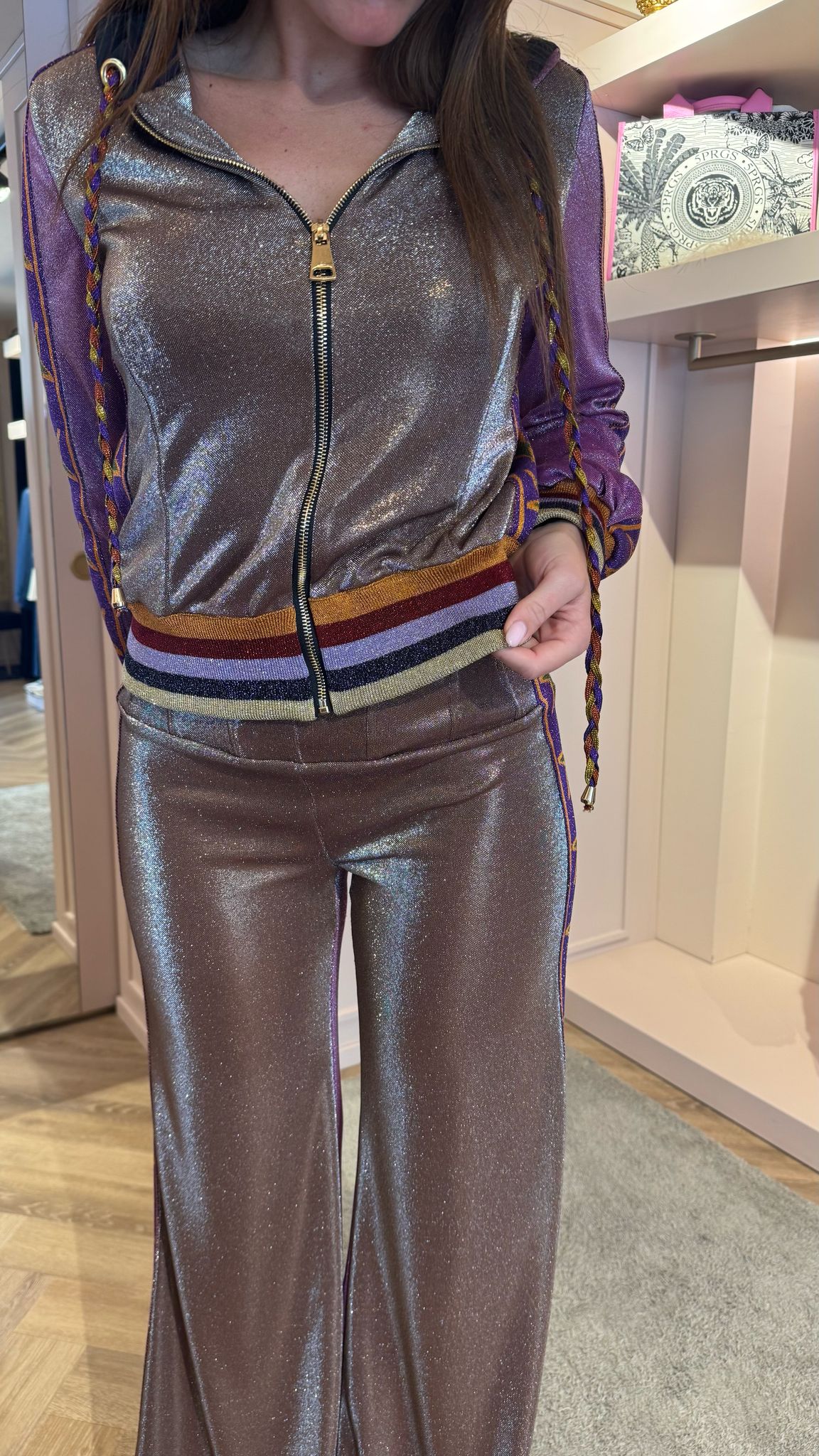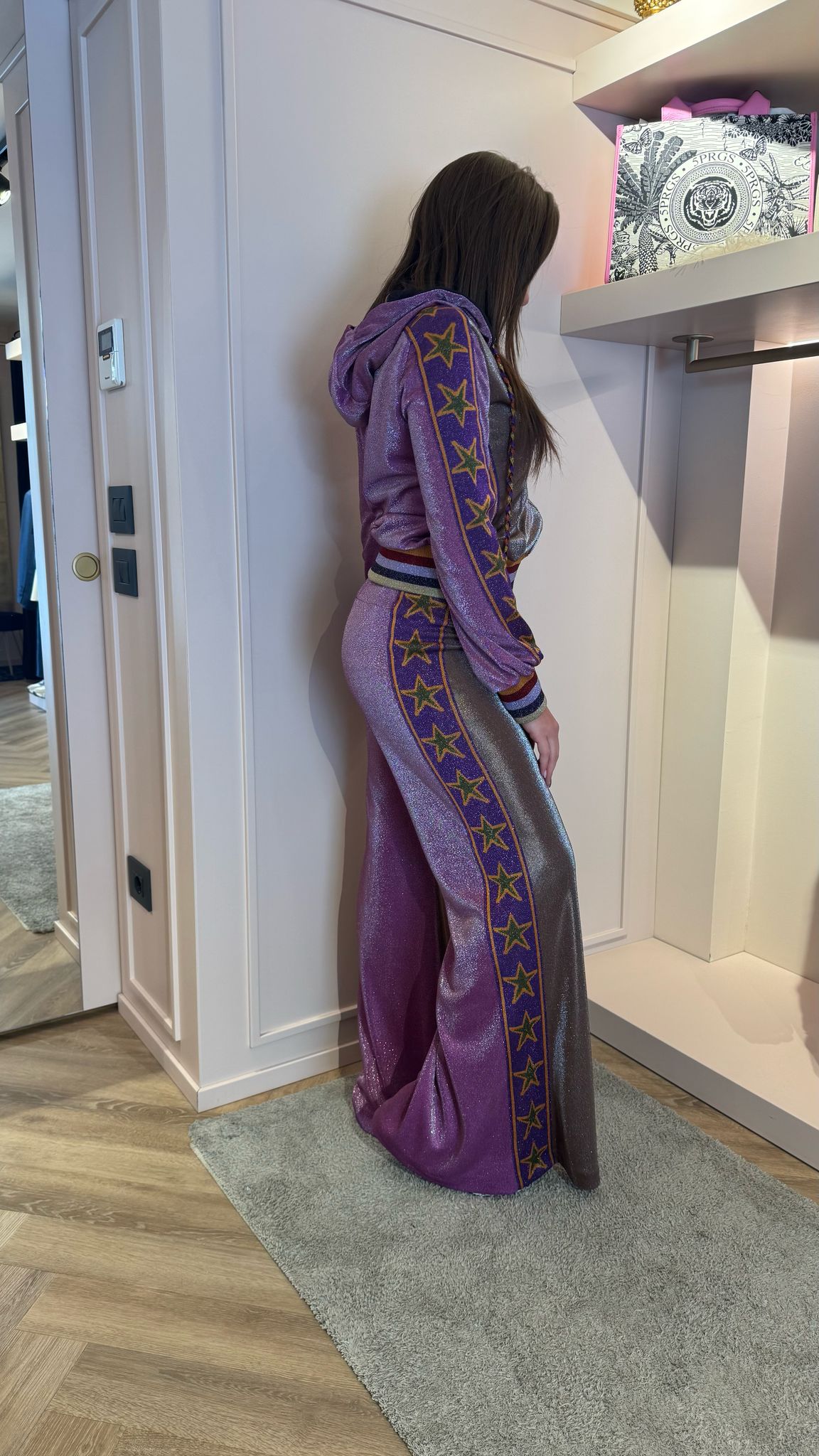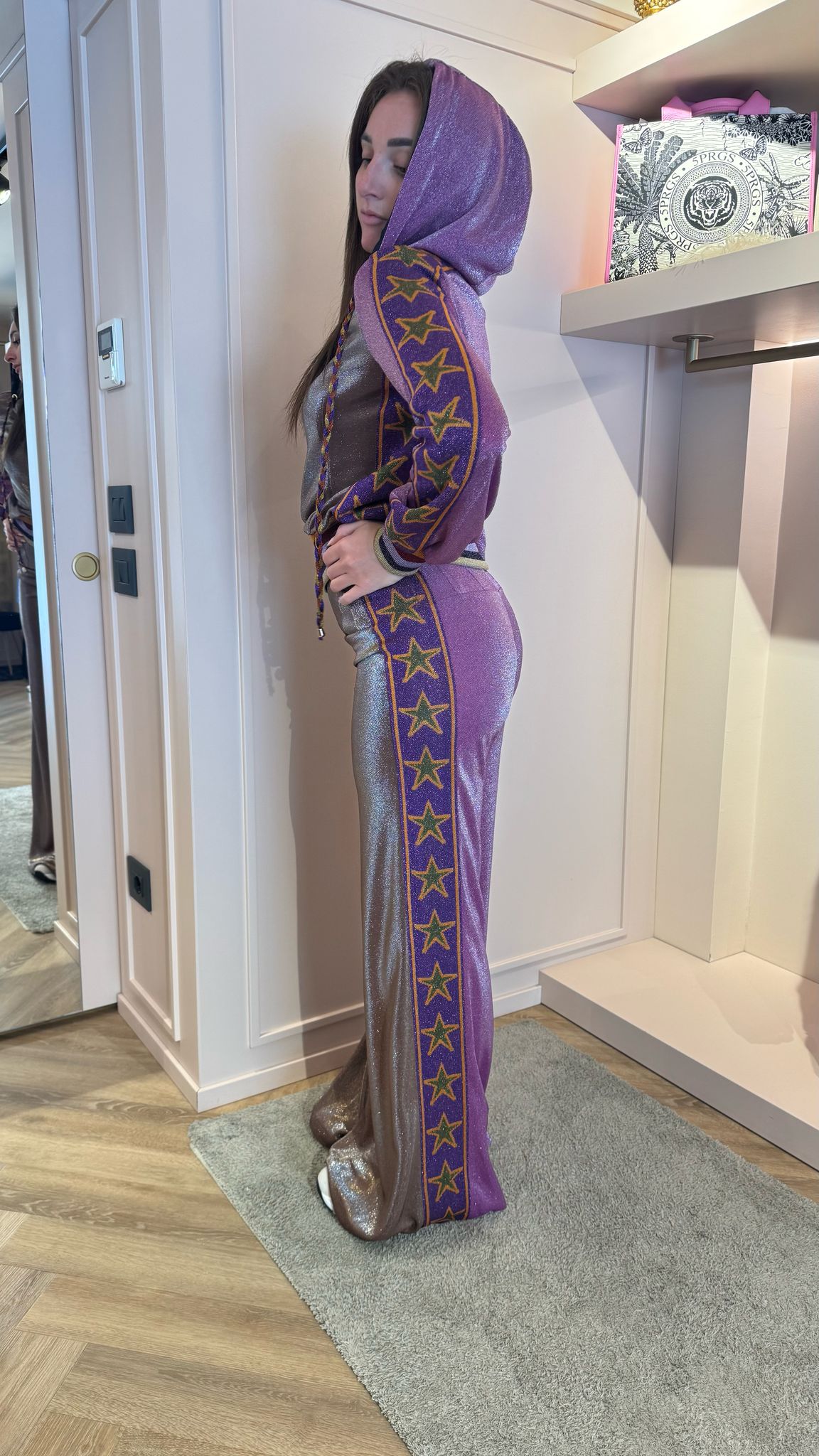 Esalta la tua silhouette con questi pantaloni in lurex bicolore, perfetti per chi ama un look deciso e glamour. Le bande laterali in lurex personalizzate con dettagli a stelle scintillanti donano un tocco audace e sofisticato, mentre il bustino integrato assicura una vestibilità impeccabile e valorizza la figura.