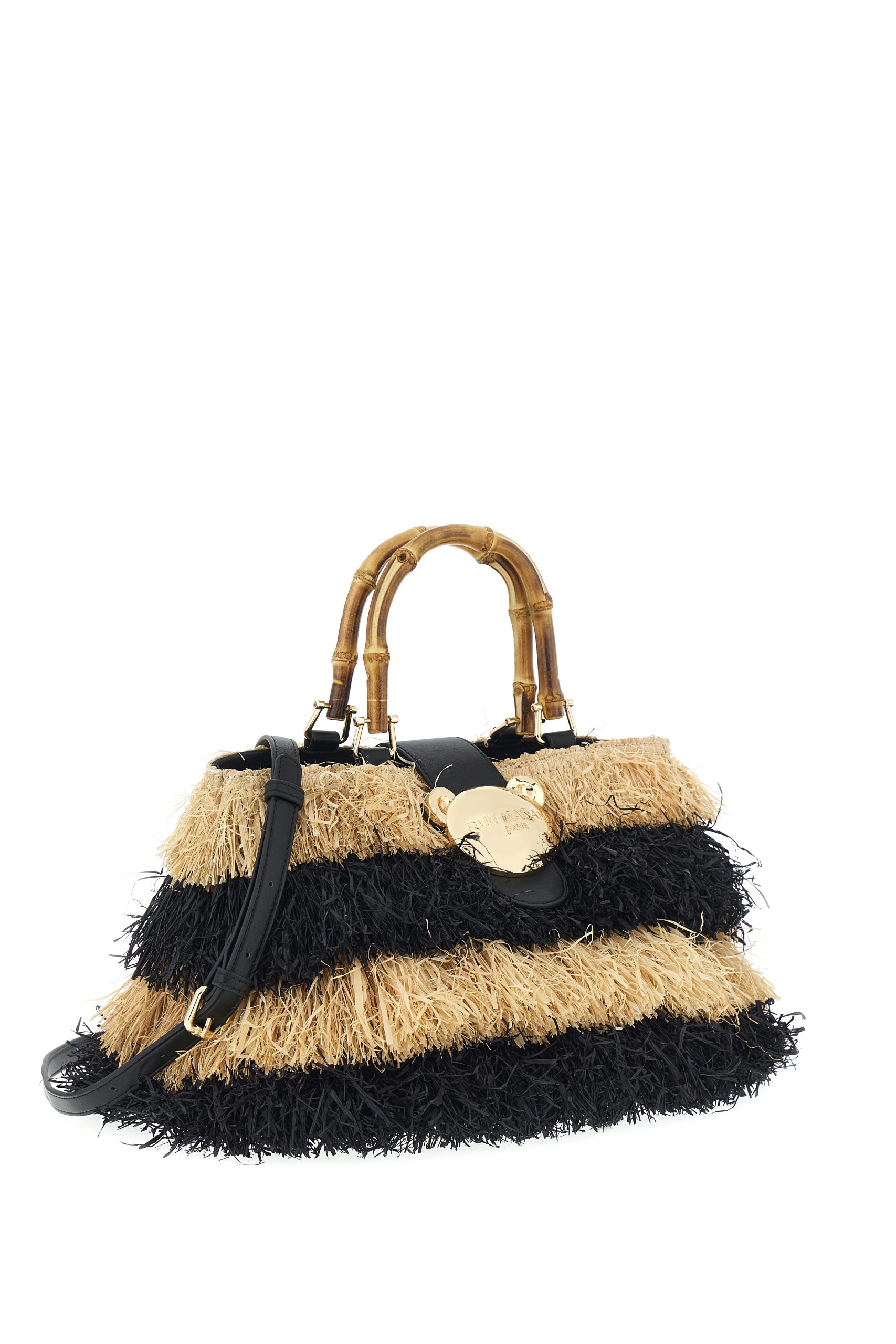 Secchiello in raffia con frange naturali, dal design raffinato e contemporaneo. I manici in bamboo aggiungono un tocco distintivo e naturale, mentre l’iconica chiusura a orsetto conferisce carattere e unicità. Dotato di tracolla removibile, offre versatilità per diverse occasioni. Interno foderato in cotone, con tasca interna per una perfetta organizzazione. La base in canvas con piedini garantisce stabilità e resistenza, completando il design con un dettaglio funzionale ed elegante. Dimensioni L 36 x H 21 x P 16 cm