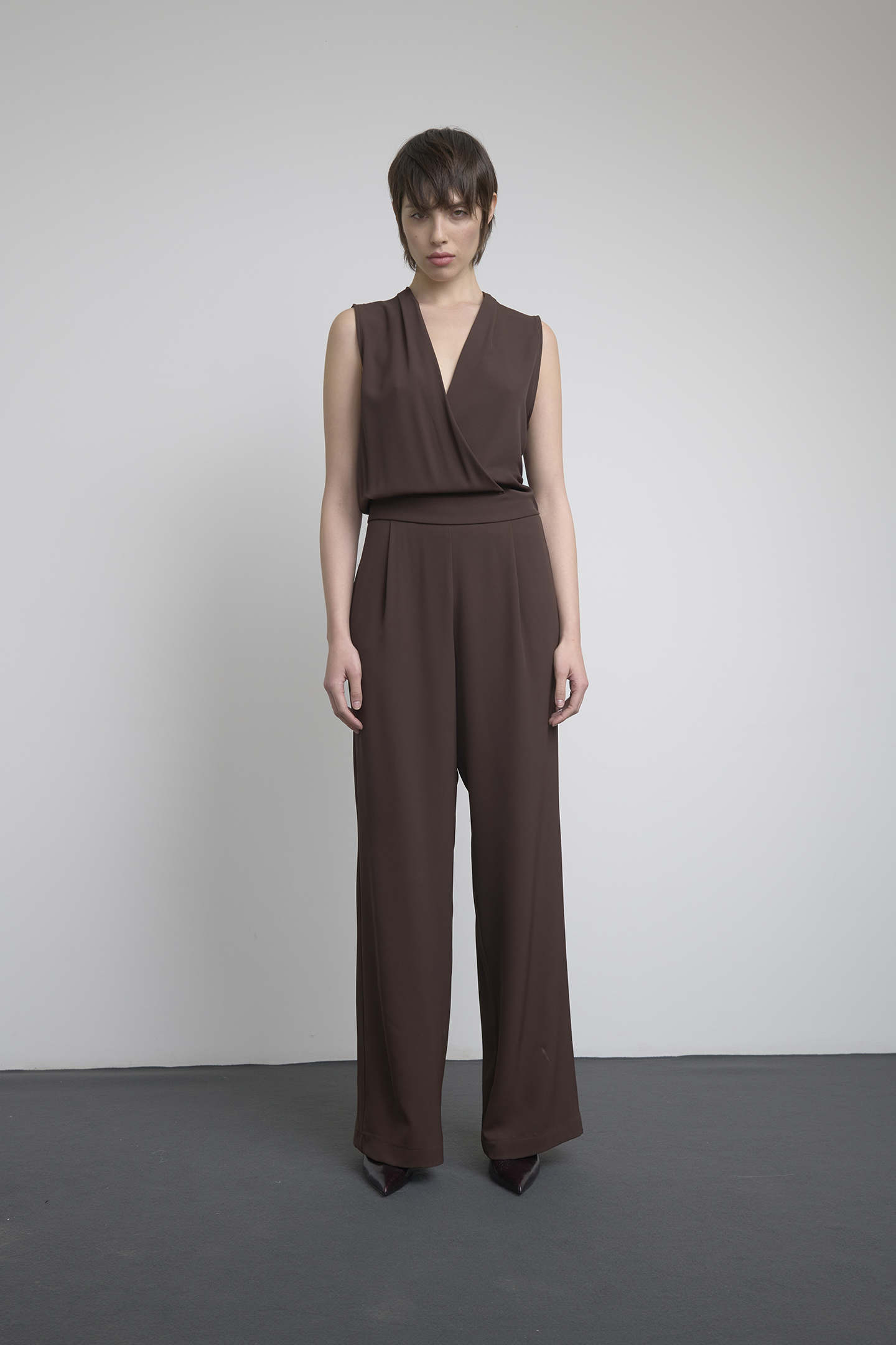 Tuta in crepe a tinta unita, dal tessuto fluido che assicura comfort e una vestibilità perfetta.