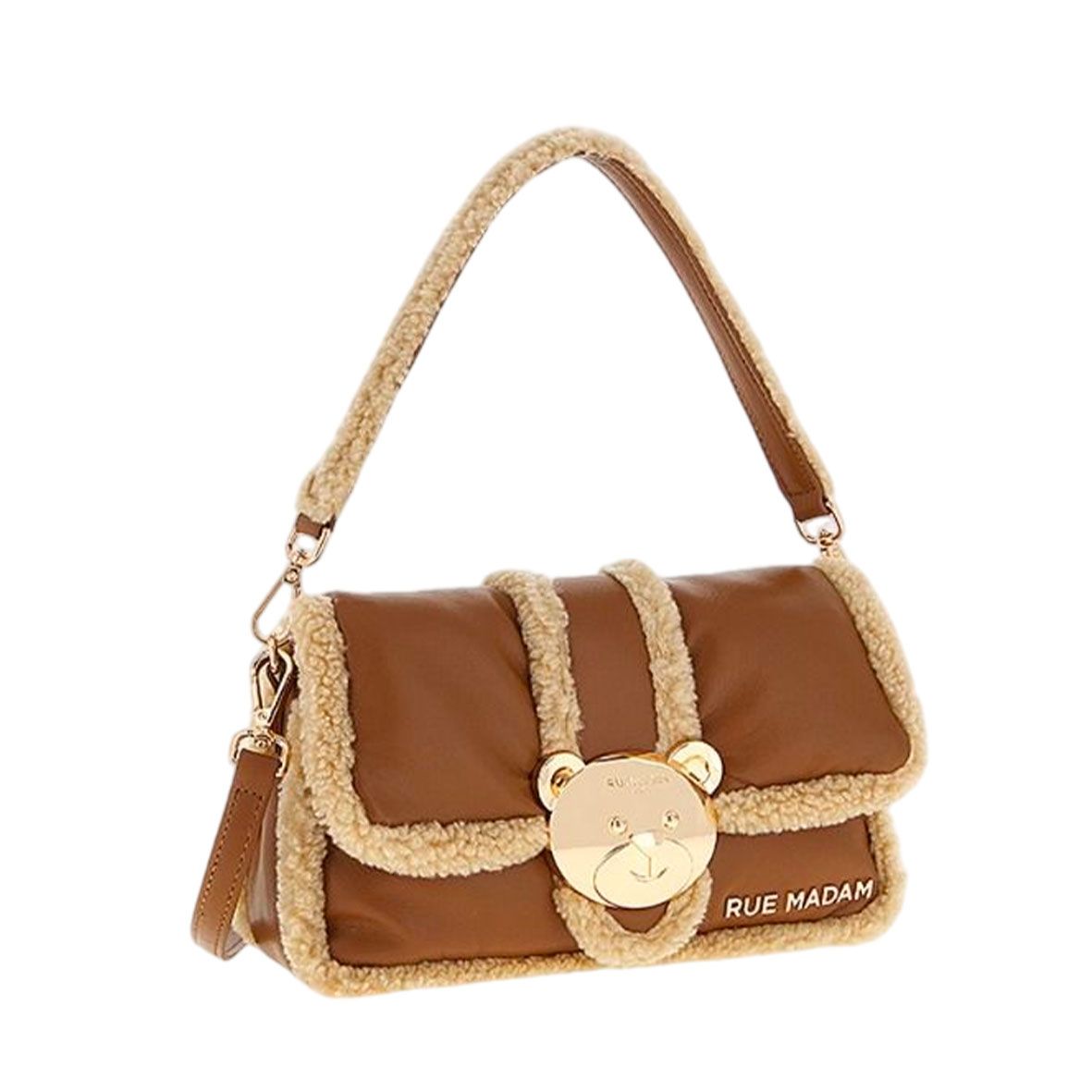 Rue Madam Paris Vermont It Borsa a Spalla in ecopelle, interno foderato, inserti in ecopelliccia, tracolla regolabile e removibile, dettagli in metallo dorato, teddy in metallo dorato, tasca interna multifunzione, chiusura automatica.